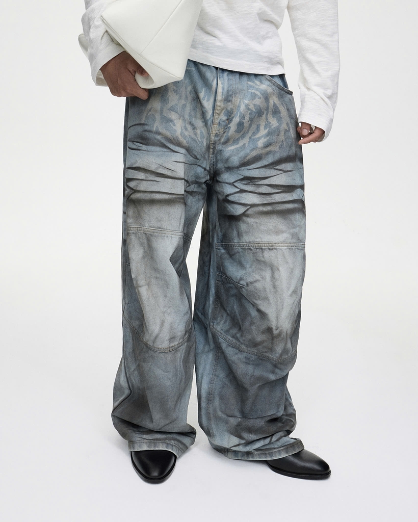 Mô tả: quần được thiết kế có phần ống rộng, đáy thụng, quần có các chi tiết sơn đen thủ công nên vị trí sơn đậm, nhạt và các chi tiết rách đều ngẫu nhiên không giống nhau, kiểu quần này sẽ che đi được nhiều khuyết điểm về chân và tăng thêm phần cá tính cho outfit của bạn.