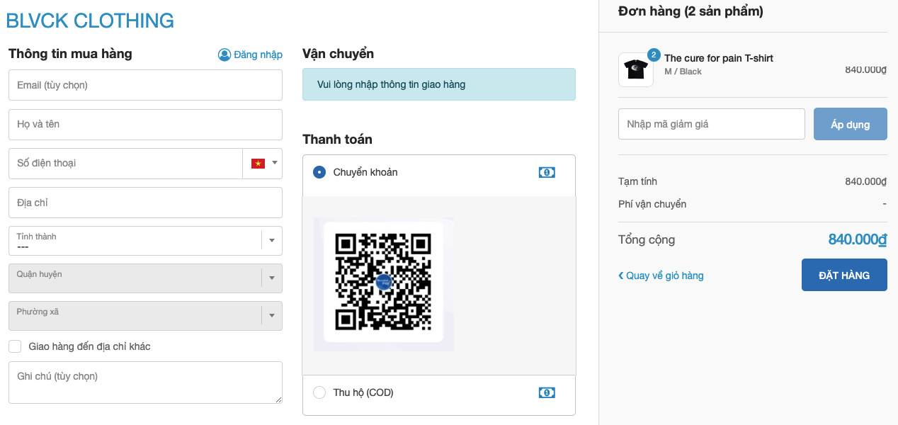 Nhập đầy đủ các thông tin, chọn hình thức thanh toán, nhập mã giảm giá vào ô ( nếu có ) và tiến hành đặt hàng.
