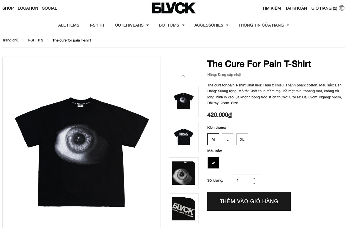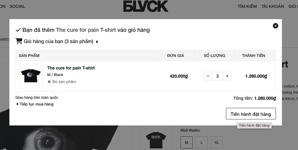 Bước 2: Click và sản phẩm muốn mua, màn hình sẽ hiển thị toàn bộ thông tin về sản phẩm, bạn có thể chọn size ( nếu có ) và thêm vào giỏ hàng.